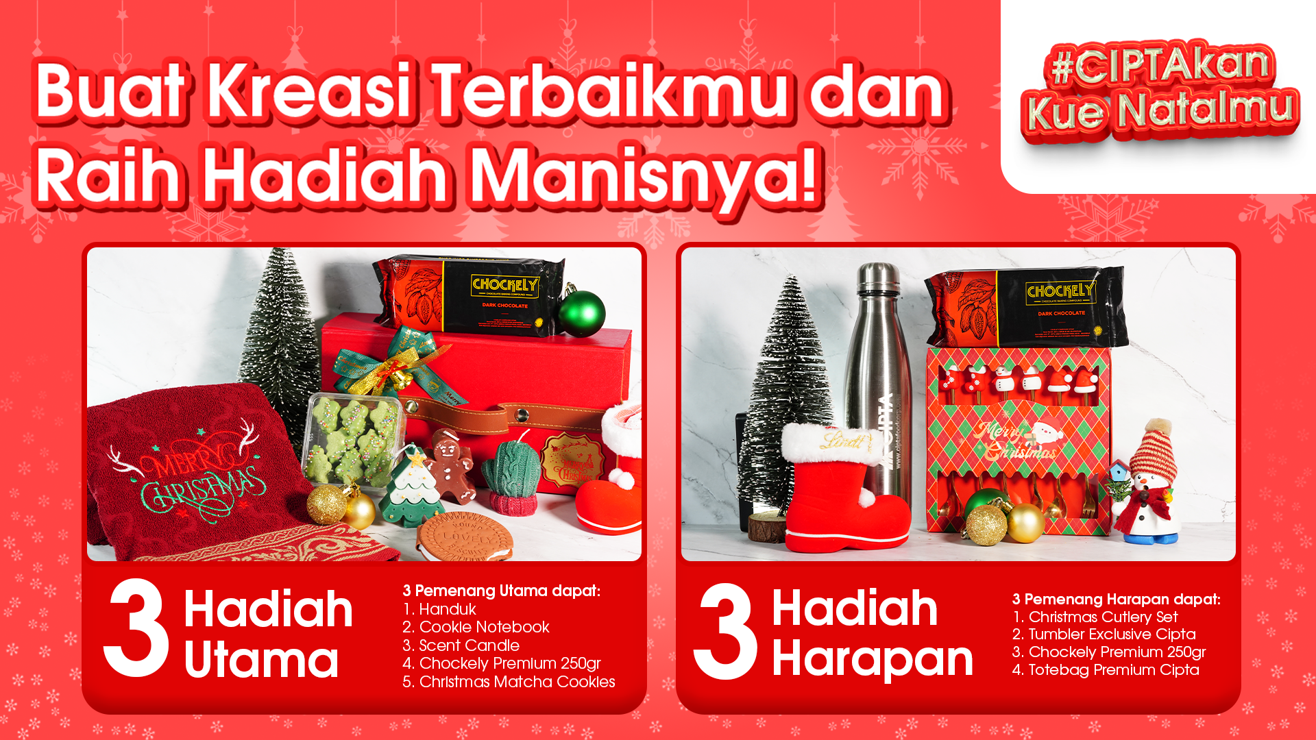 Menjelang perayaan Natal, PT Cipta kembali menghadirkan kompetisi menarik bertajuk #CIPTAkanKueNatalmu. Program ini dirancang sebagai ruang bagi para pecinta baking untuk menunjukkan kreativitas melalui pembuatan kue atau roti bertema Natal, sekaligus berkesempatan memperoleh hadiah eksklusif.